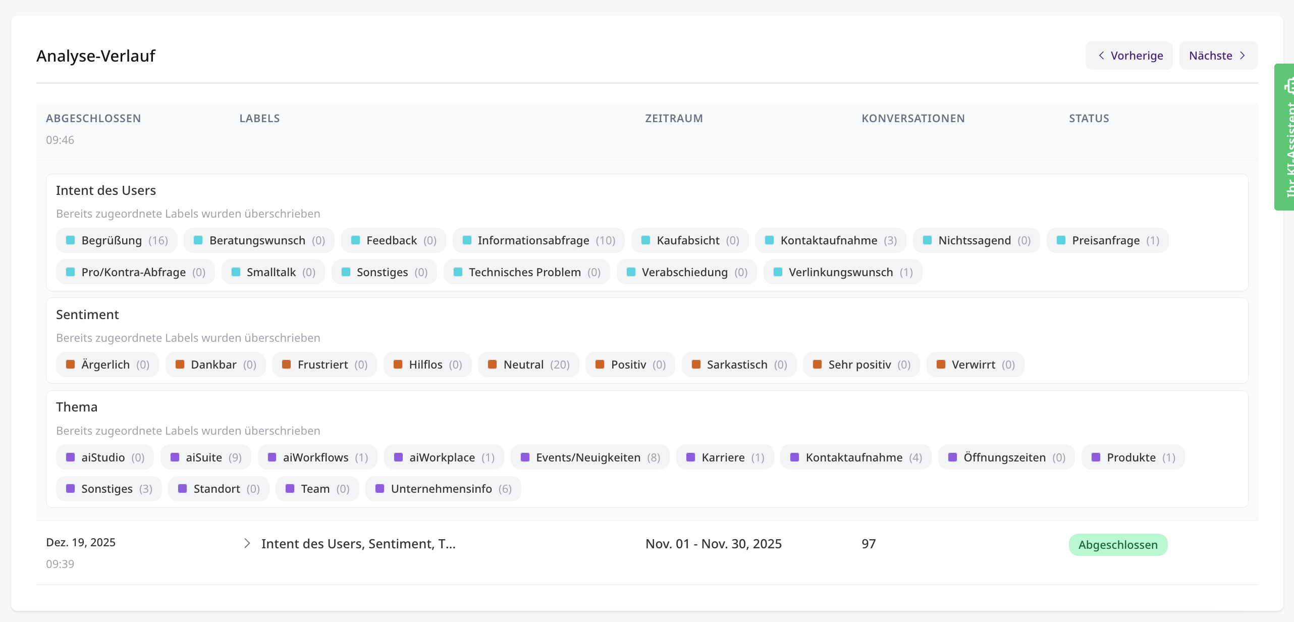 Der Fortschritt und das Ergebnis der Analyse sind im Analyse-Verlauf einsehbar. Dort sehen Sie, wann eine Analyse abgeschlossen wurde, welche Kategorien enthalten sind, welcher Zeitraum ausgewertet wurde und wie viele Konversationen analysiert wurden. Bereits zugeordnete Labels werden entsprechend Ihrer Konfiguration übernommen oder überschrieben.