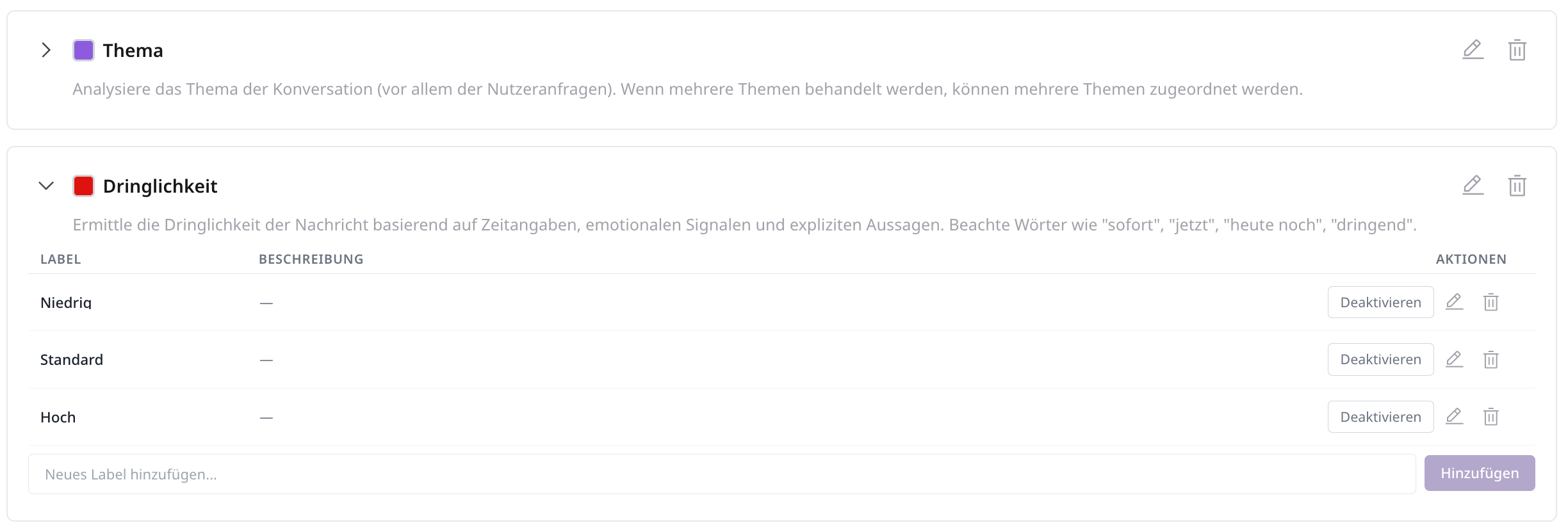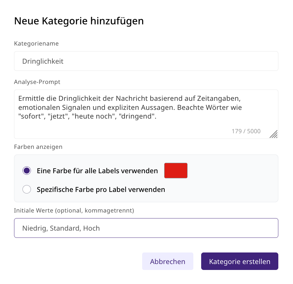 Beim Anlegen einer neuen Kategorie vergeben Sie einen aussagekräftigen Kategorienamen. Zusätzlich können Sie einen Analyse-Prompt hinterlegen. Dieser Prompt enthält die Anweisungen, nach denen die KI die Konversationen auswertet und die passenden Labels vergibt. Je präziser diese Beschreibung ist, desto besser fällt das Analyseergebnis aus. Definieren Sie die Label-Werte, z.B. „Niedrig“, „Standard“ und „Hoch“ für die Kategorie "Dringlichkeit". Diese dienen als mögliche Ausprägungen innerhalb der Kategorie. Für eine bessere Übersicht können Farben vergeben werden: Sie haben die Möglichkeit, eine einheitliche Farbe für alle Labels einer Kategorie zu verwenden oder spezifische Farben pro Label festzulegen.