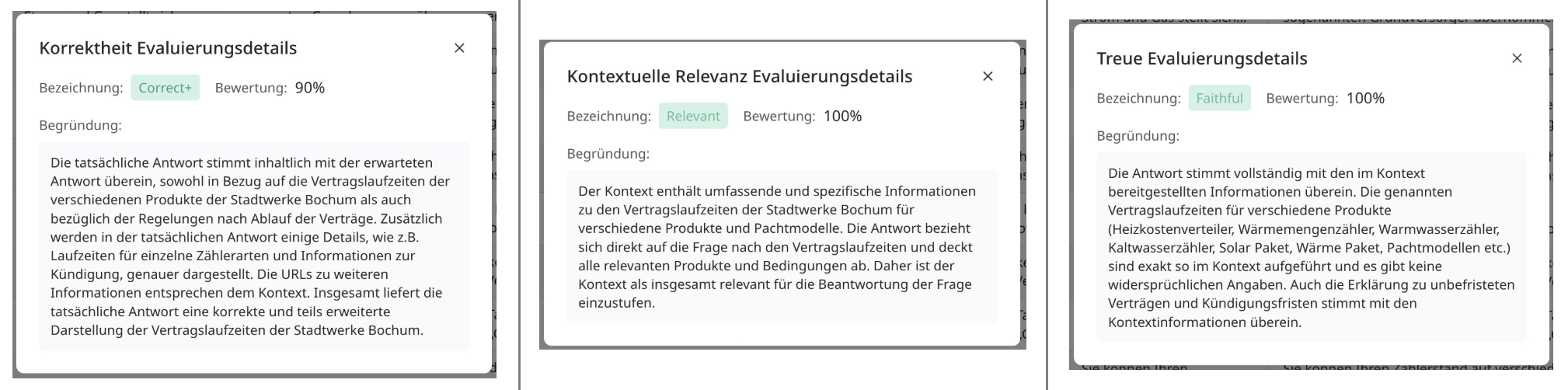 Für jede Bewertung in den Kategorien Korrektheit, Relevanz und Treue kann zudem eine detaillierte Begründung eingesehen werden. Diese erklärt nachvollziehbar, warum die jeweilige Bewertung vergeben wurde und bezieht sich auf den Vergleich zwischen Antwort, erwarteter Antwort und Kontext.