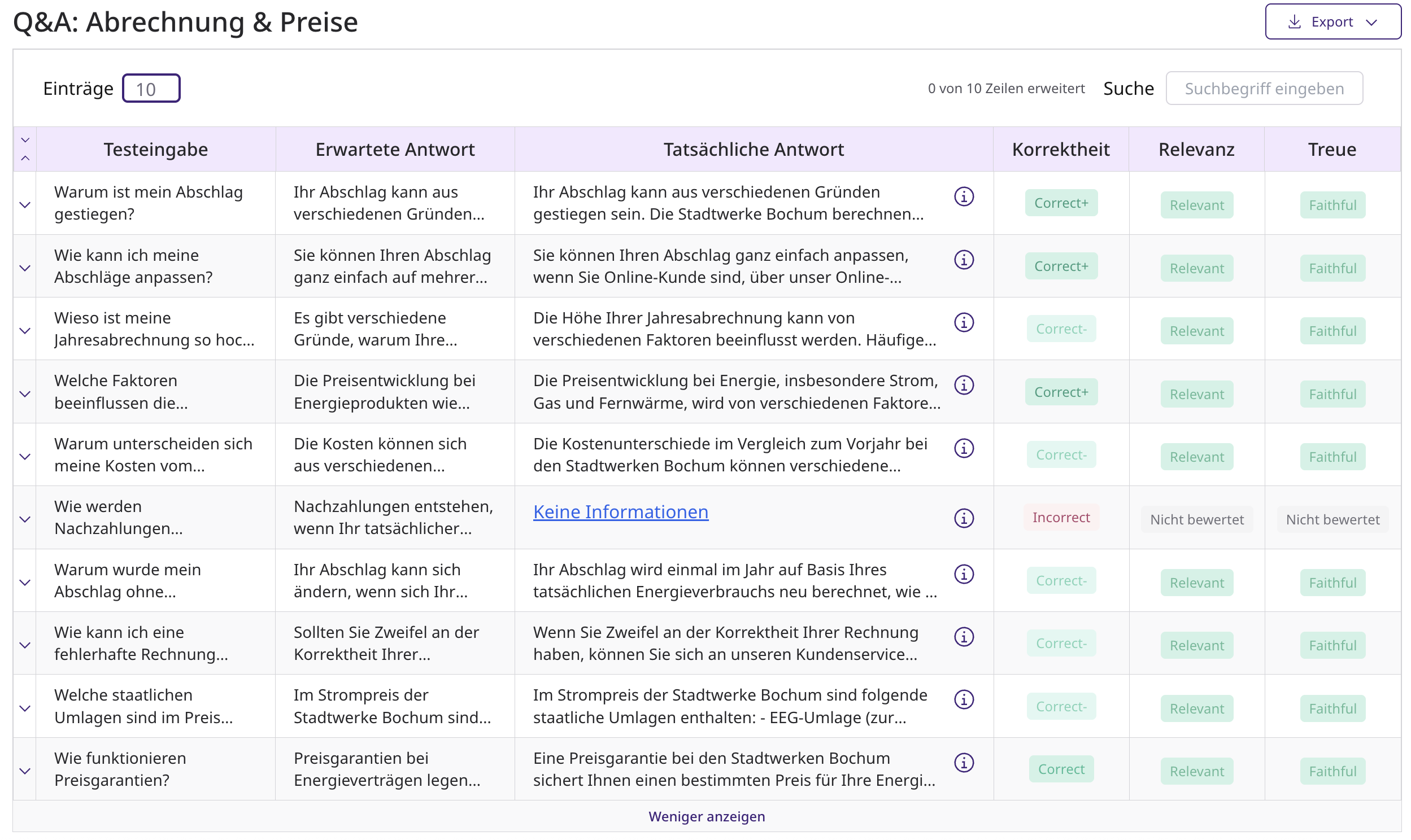 Im Menü unter Testing > Reports können Sie die Ergebnisse der durchgeführten Testläufe einsehen, analysieren und exportieren. Die Testberichte bieten eine transparente Übersicht über die Leistungsfähigkeit des KI-Assistenten in Bezug auf Korrektheit, Relevanz und Treue. Sie unterstützen die Analyse und kontinuierliche Verbesserung des Systems durch gezielte Evaluation und Nachverfolgung von Änderungen über verschiedene Testläufe hinweg.