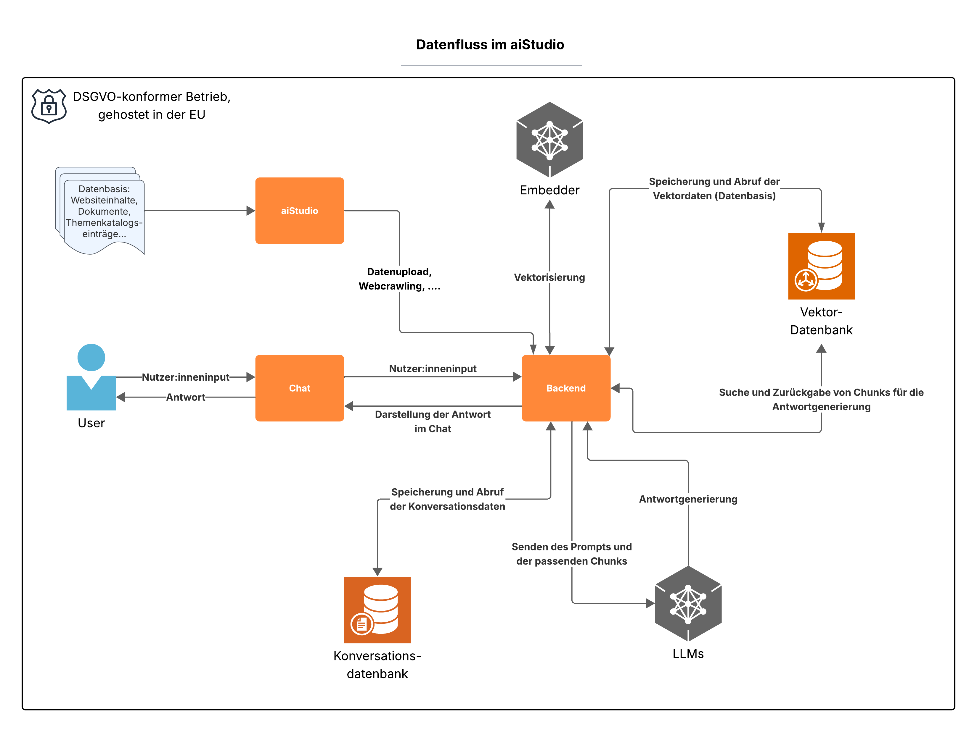 Die folgende Grafik bietet eine detaillierte Übersicht über die Datenverarbeitung innerhalb des aiStudios, wobei besonderes Augenmerk auf den Weg der Informationen von der Quelle bis zur Ausgabe gelegt wird. Der Prozess beginnt mit einer umfassenden Datenbasis, die Websiteinhalte, Dokumente und Themenkatalogeinträge umfasst. Diese Daten werden in aiStudio hochgeladen oder durch Webcrawling erfasst. Anschließend werden die Daten durch den Embedder vektorisiert, um sie für die weitere Verarbeitung vorzubereiten.